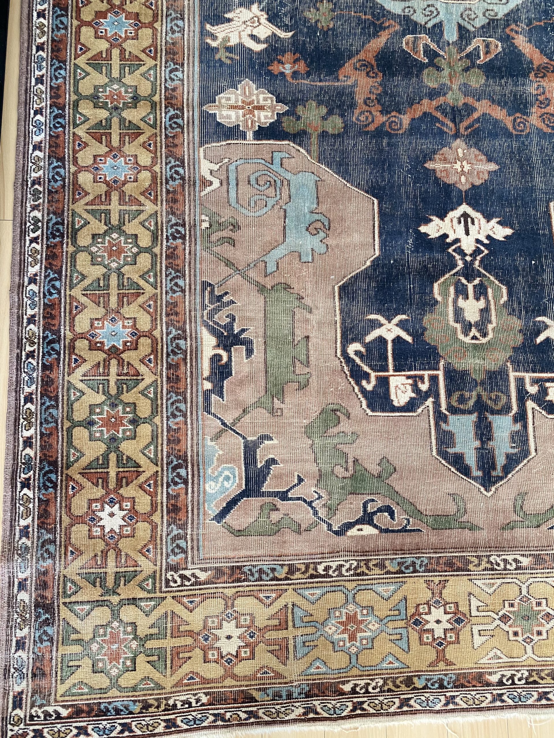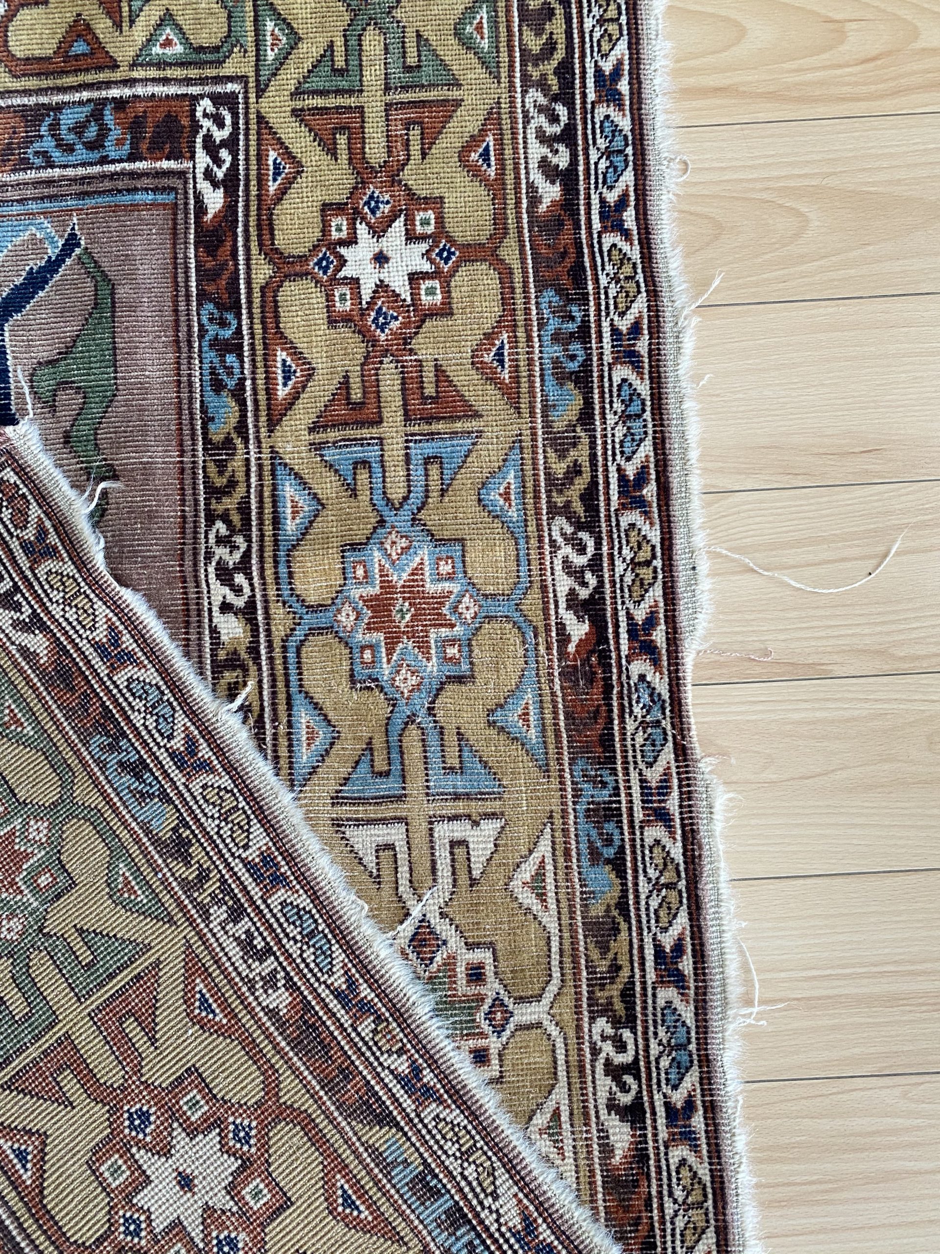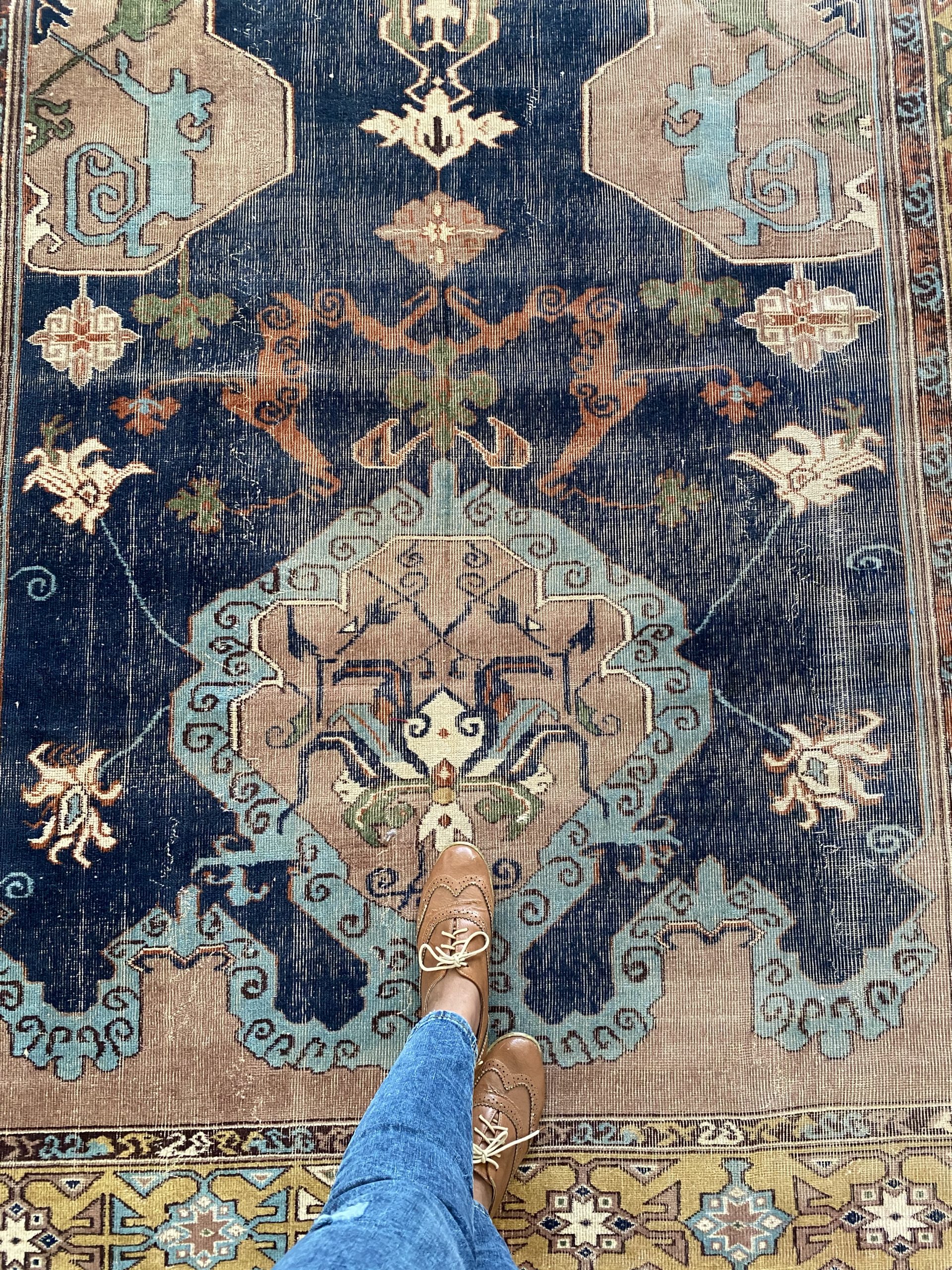 The rug is constructed with wool on wool pile with wear noted in one side of the rug  . Please note wear are common in vintage rugs and that  makes the rug so special