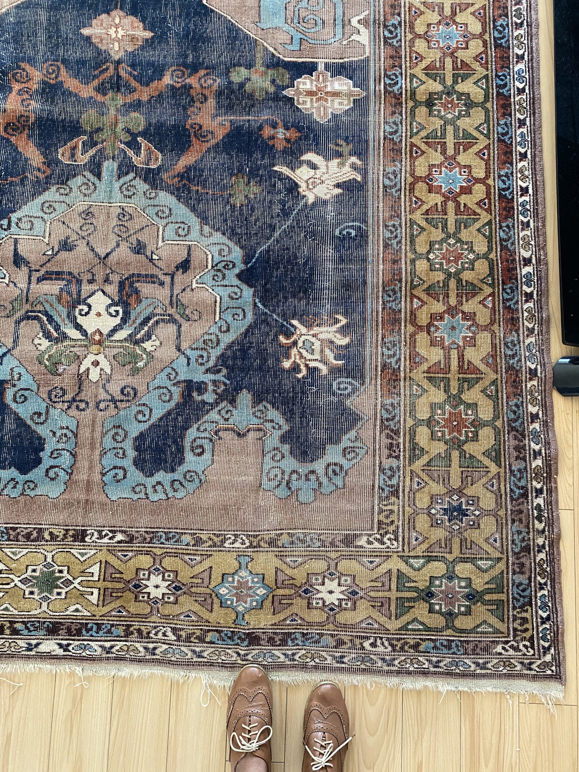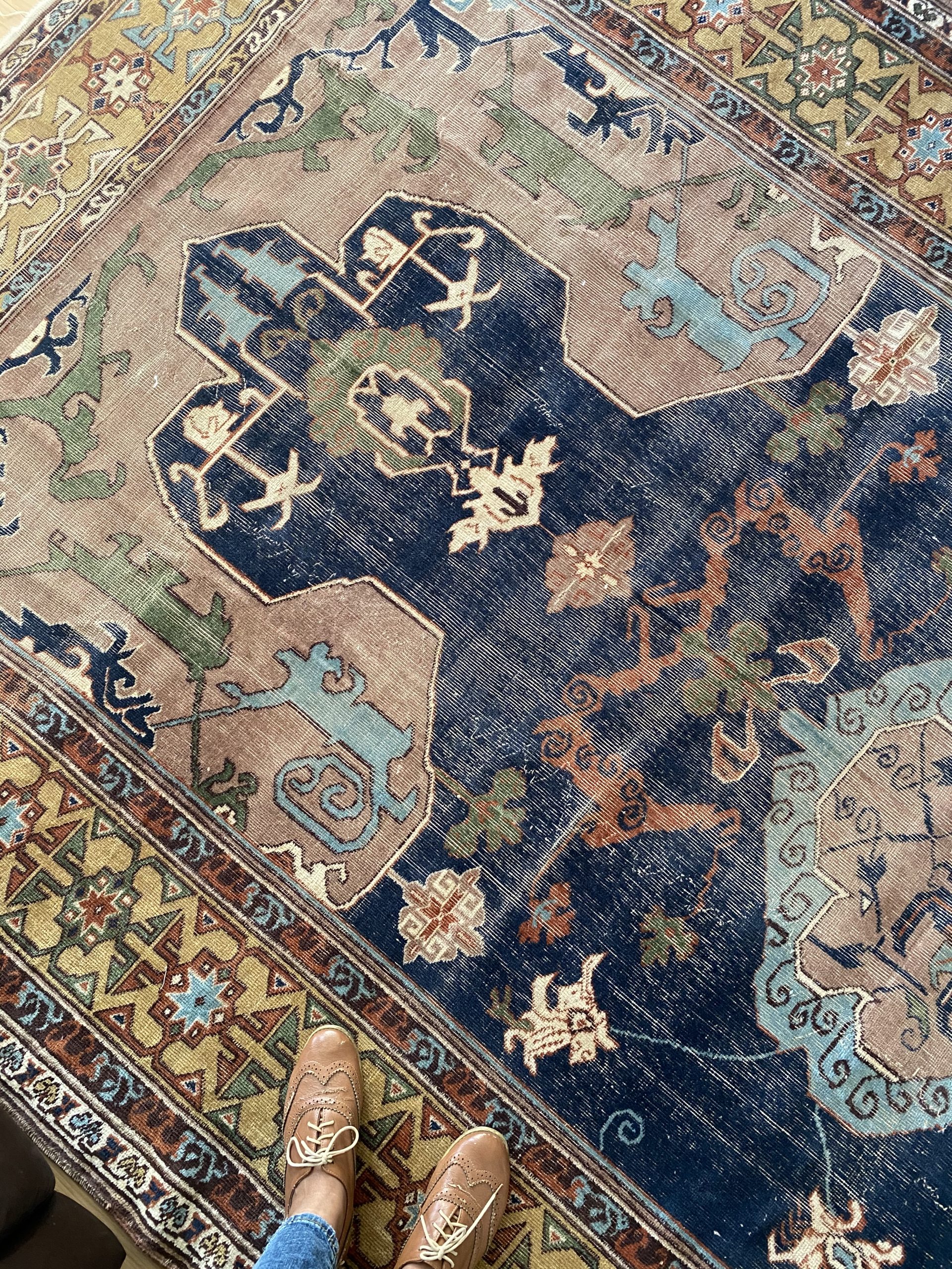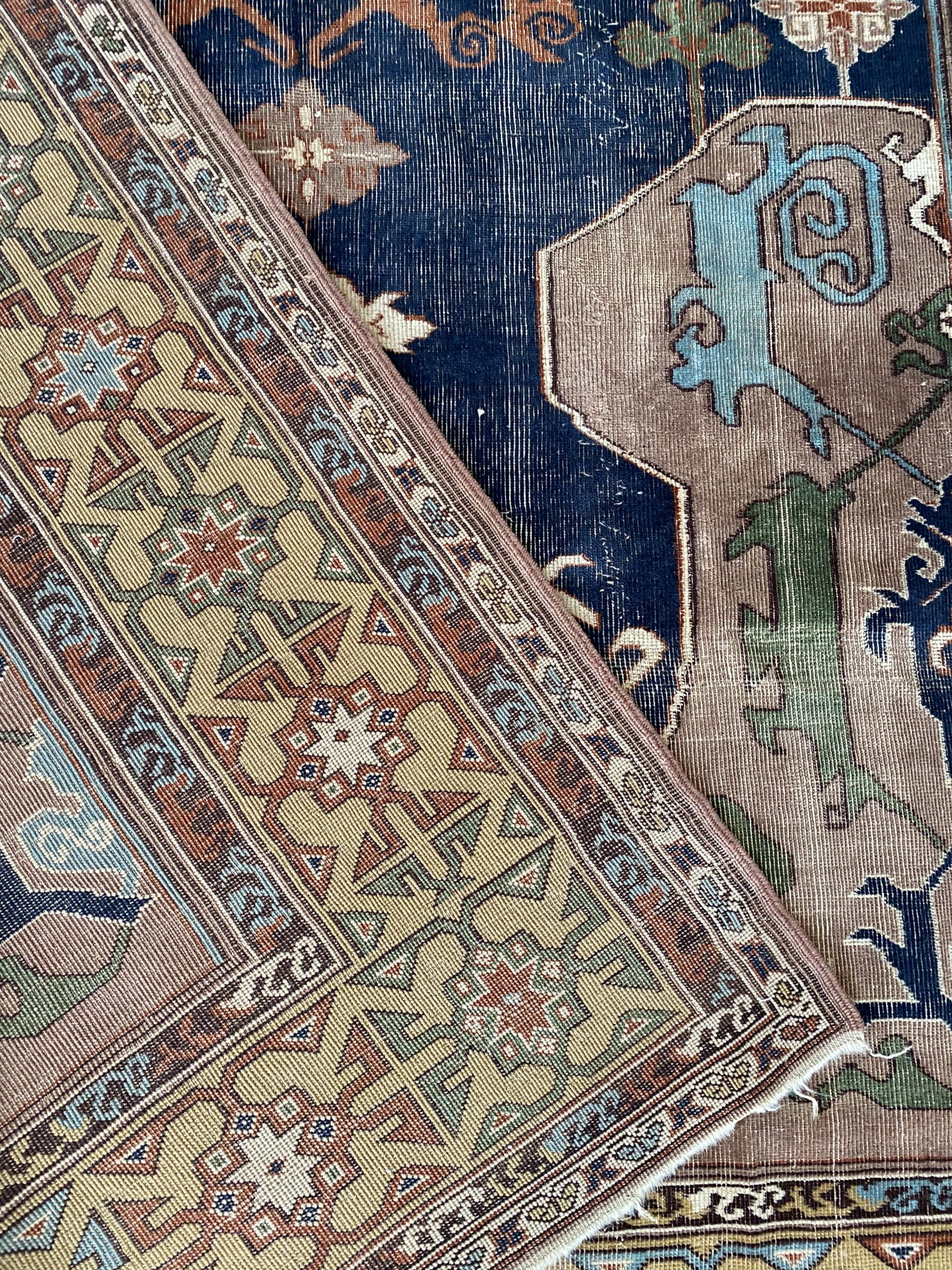 The rug is constructed with wool on wool pile with wear noted in one side of the rug  . Please note wear are common in vintage rugs and that  makes the rug so special