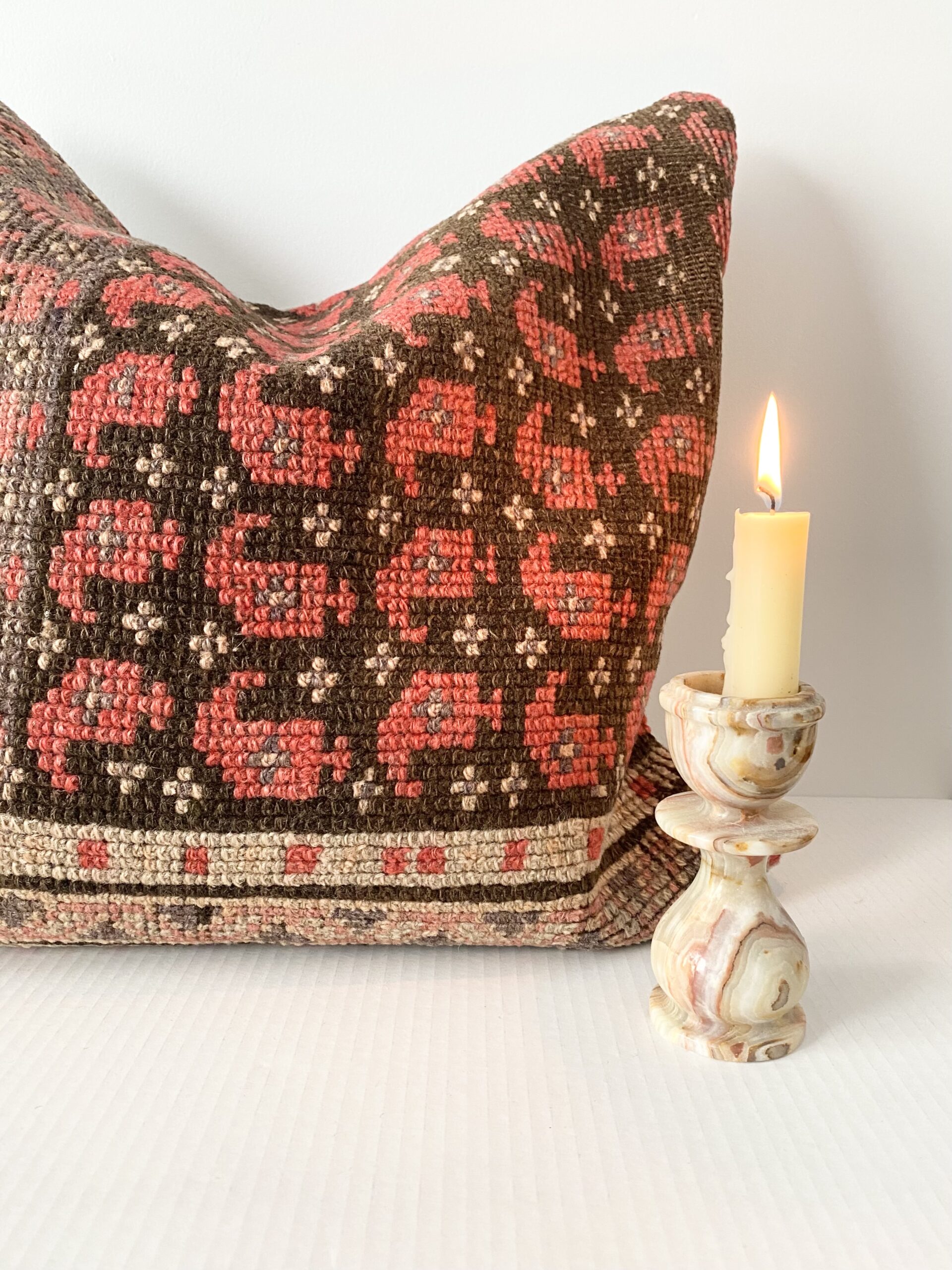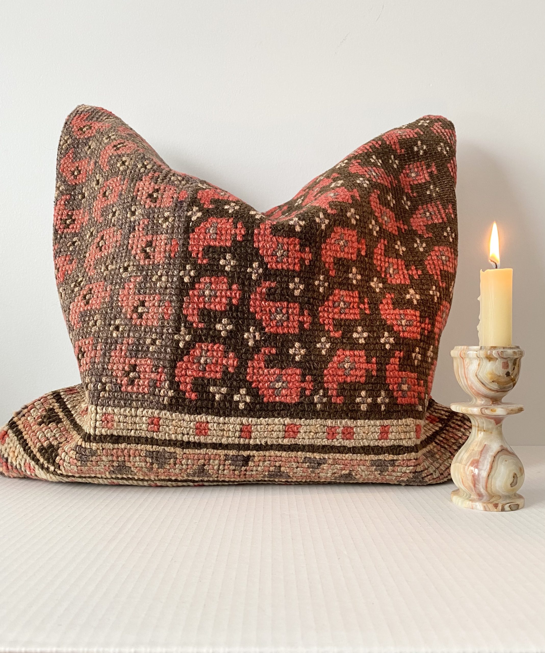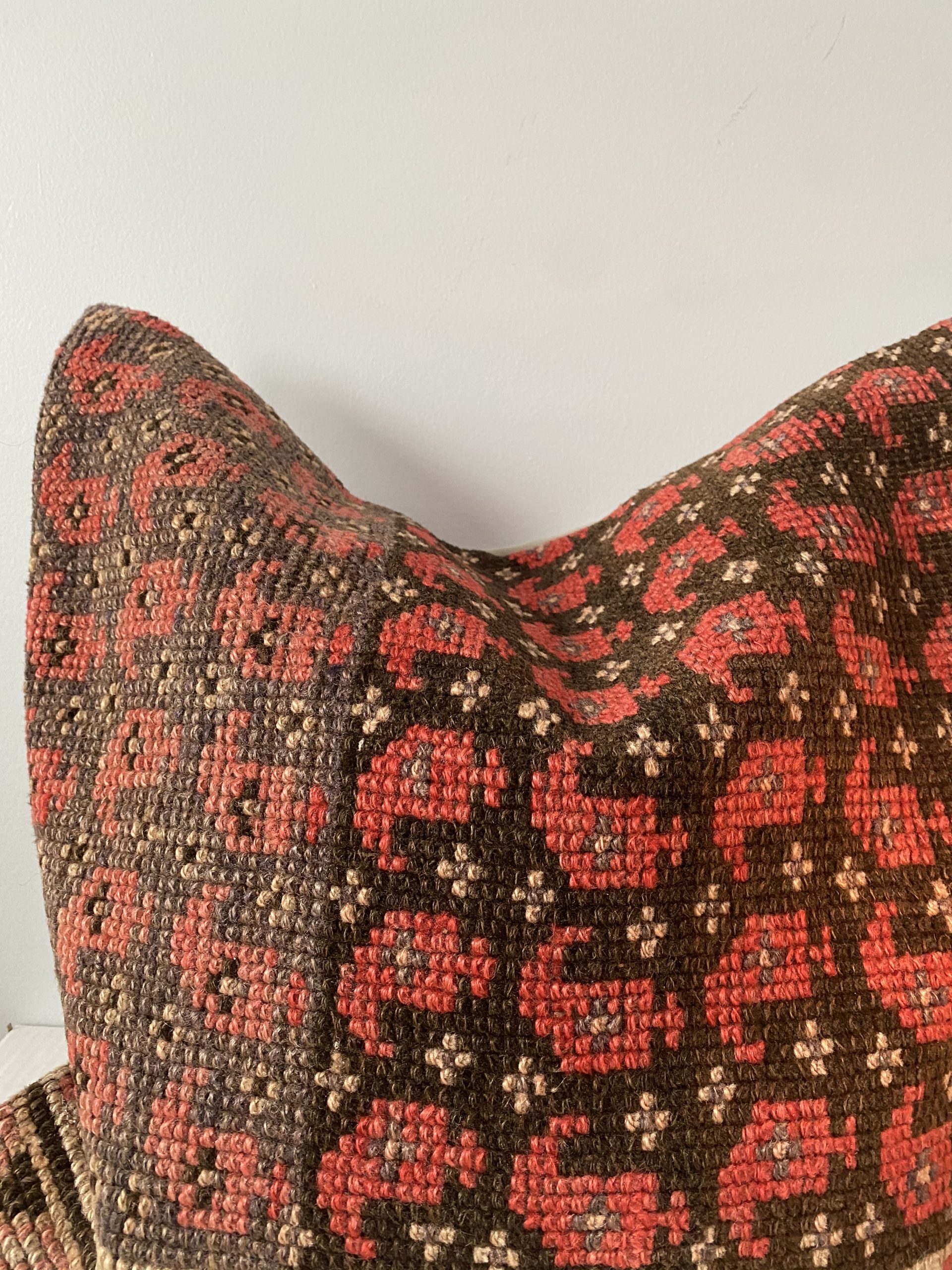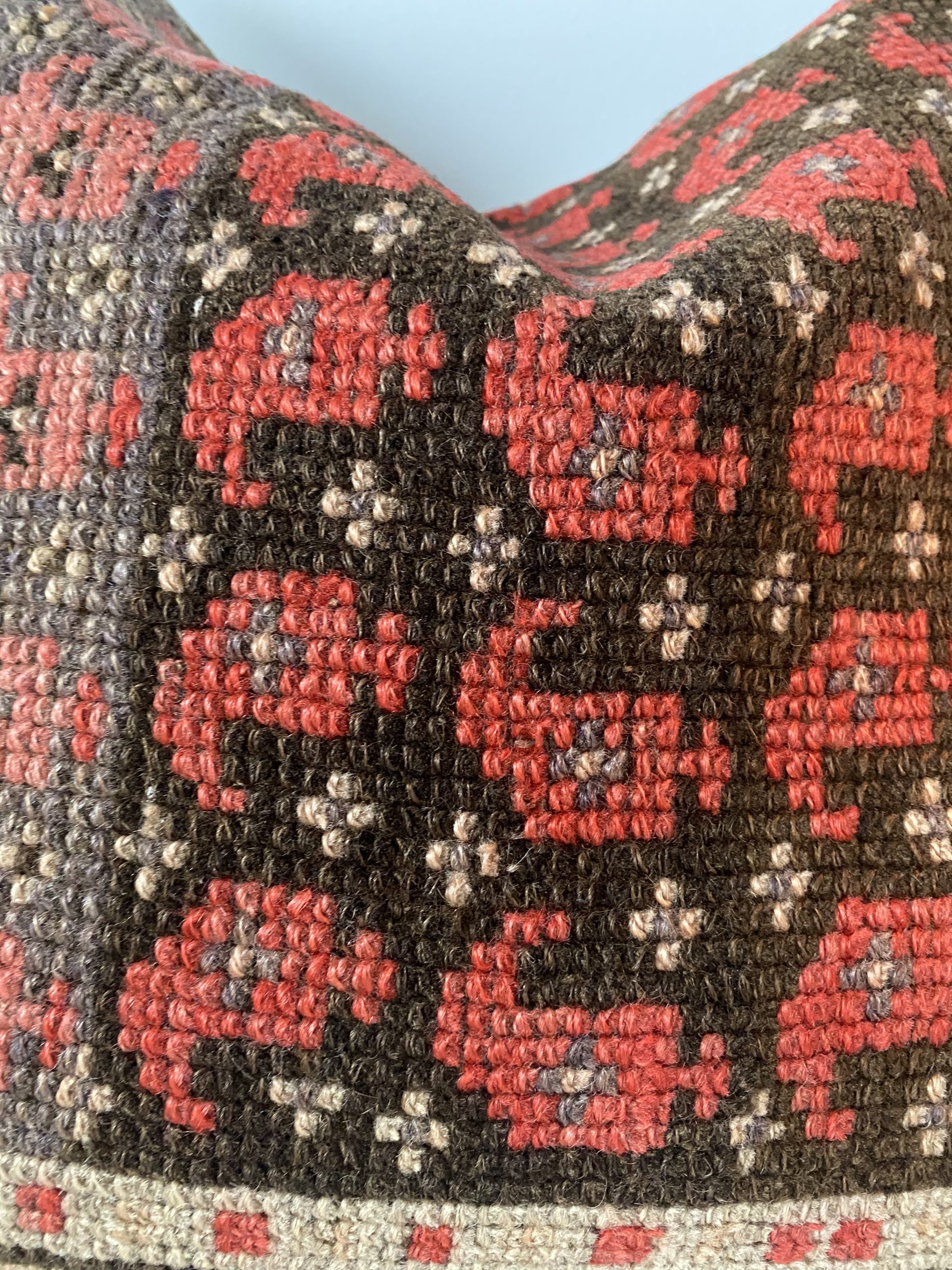 This pillow cover is made from Turkish rug which is a wool on cotton pile. New pillow cover made from up cycled rug have a lot of character to add to your space.
